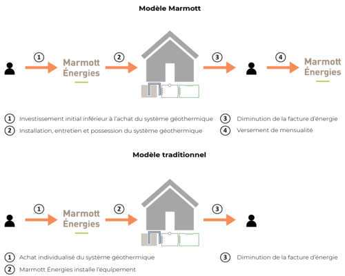 Par ce modèle d’affaires innovant, vous pouvez minimiser l’investissement initial en transférant la propriété du système à Marmott Énergies S.E.C. qui devient votre fournisseur d’énergie géothermique.